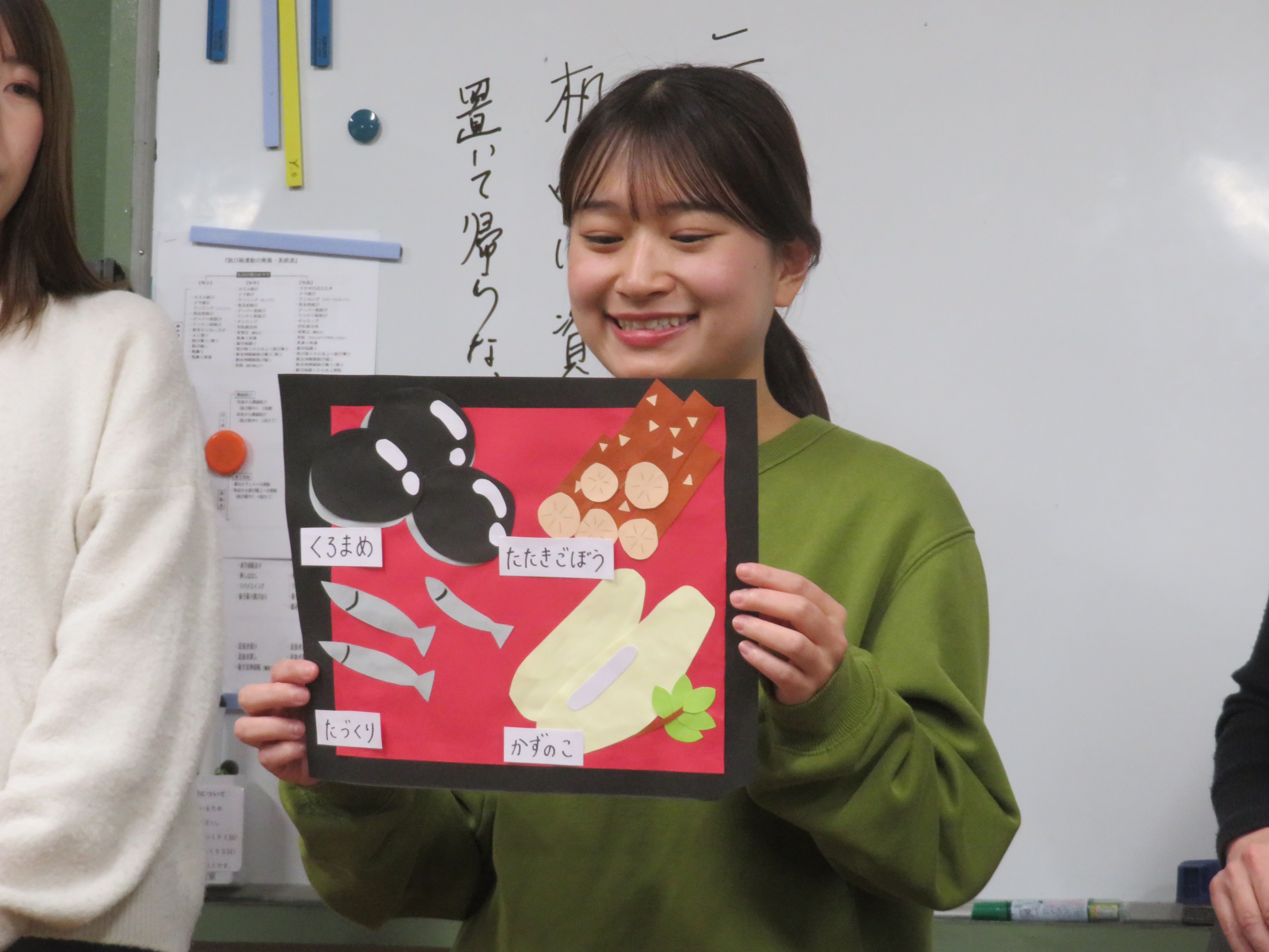子どもの食と栄養 グループ発表 2026.01.26 日本には四季があり、さまざまな伝統行事があります。 子どもたちの食べることへの関心を高めるために、行事食を調べグループ発表を行いました。 お正月や節分の食べ物は、日本の風土や健康に密接につながっていますね。 #箕面学園福祉保育専門学校 #みのお #保育士 #幼稚園教諭 #みのがく #保育 #こども 前 一覧はこちら 次